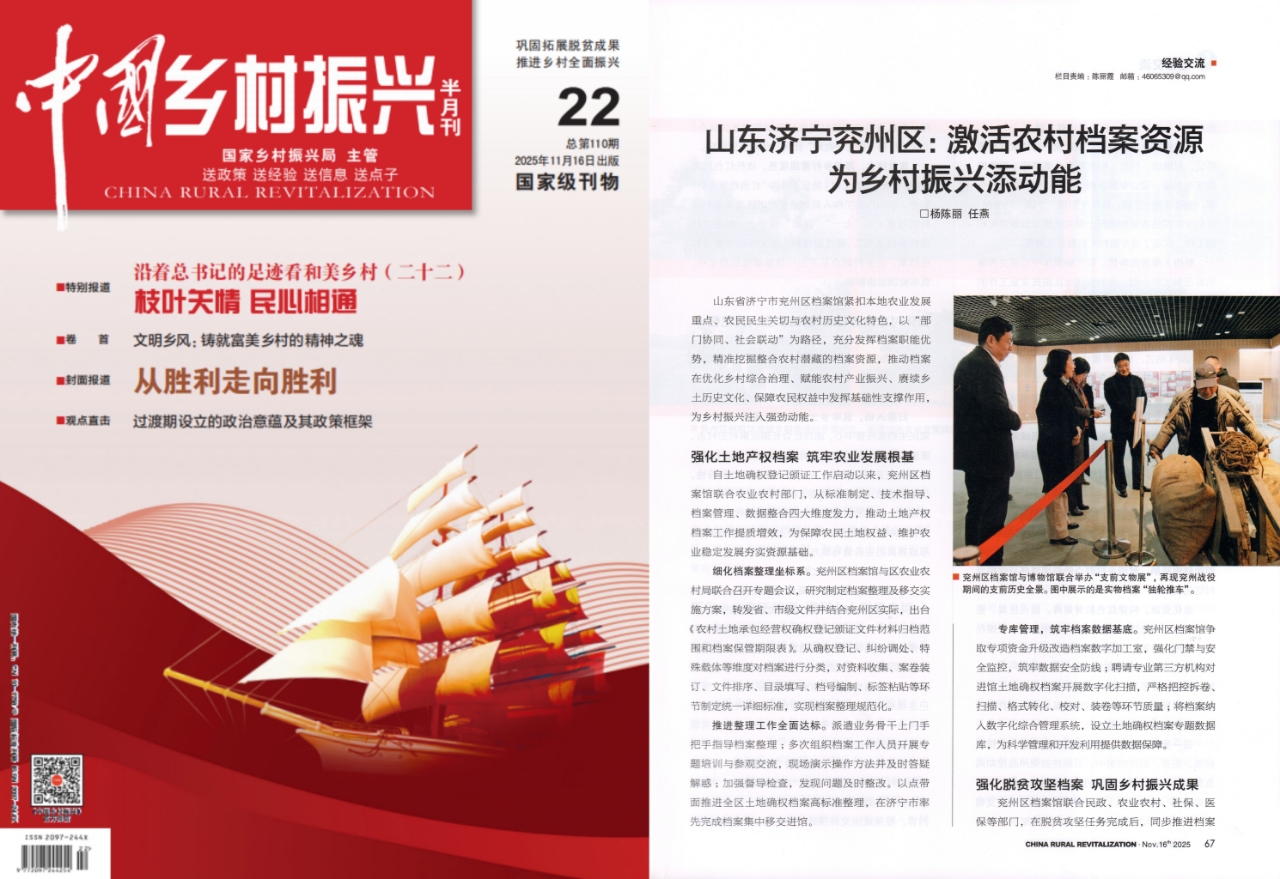 近日,兖州区档案馆宣传工作喜获佳绩,兖州区充分激活农村档案资源为乡村振兴添动能相关工作经验做法,被国家级刊物《中国乡村振兴》杂志刊发。