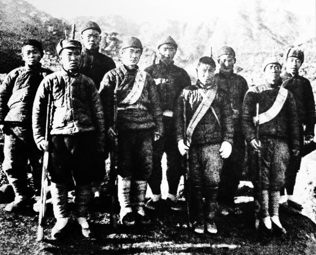 参加我们起义队伍当时到达徂徕山的约100多人,其中有工人、农民、士兵,也有教员、学生、职员。他们穿的服装各式各样,有穿棉袍的,有穿大褂的,有穿制服的,还有个别穿西装的;手里的武器更是五花八门,有“汉阳造”,也有“老套筒”“土压五”和匣子枪,还有大刀、长矛等等。服装虽然不整齐,武装虽然不精良,但是,同志们精神饱满,情绪高昂。