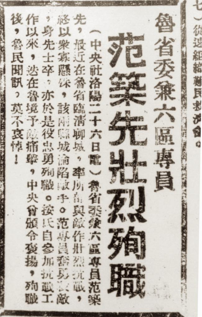1938年11月28日,《新华日报》刊登时评《鲁省委兼六区专员范筑先壮烈殉职》:“鲁省委兼六区专员范筑先,最近在鲁省临清聊城,率所部与敌作壮烈抗战,终以众寡悬殊,该两县城沦陷敌手,范专员奋勇杀敌,身先士卒,亦于是役忠勇殉职……”