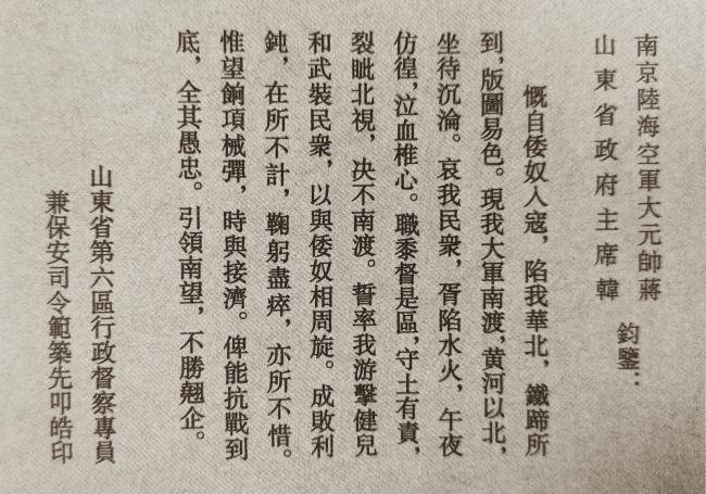 1937年11月19日,范筑先发出坚持抗日绝不南渡的皓电