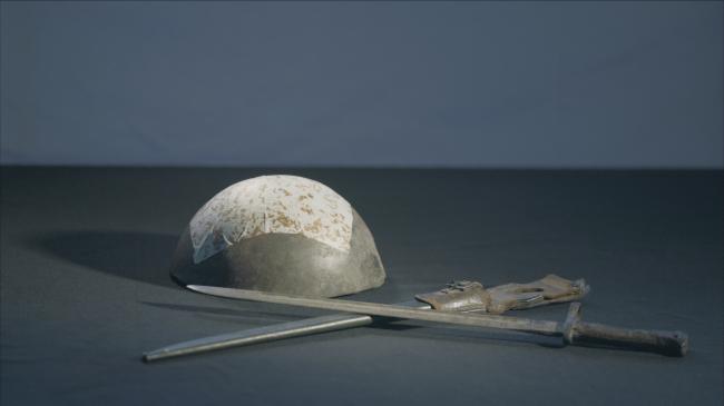 本期档案:陆房突围战斗中缴获的日军刺刀和头盔