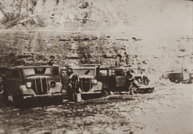 陆房突国战中被我军击毁的日军运输车队