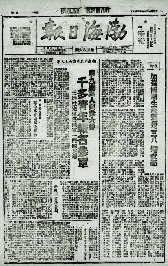 大参军的热潮席卷了山东抗日根据地的其他战略区。莒南县洙边村18岁的女青年梁怀玉,长相俊俏、能歌善舞,是当地出了名的“金凤凰”。在县参军大会上,她第一个上台发言:“谁当兵谁光荣,谁第一个报名参军,俺就嫁给谁。”