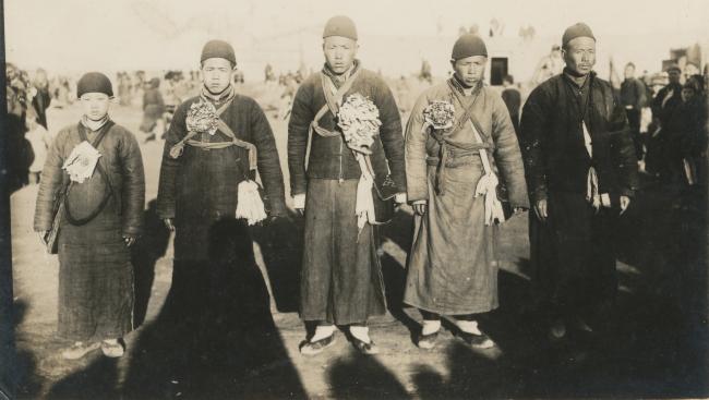 广饶县九区拥军参军大会上挂花队给踊跃报名参军的青年挂花